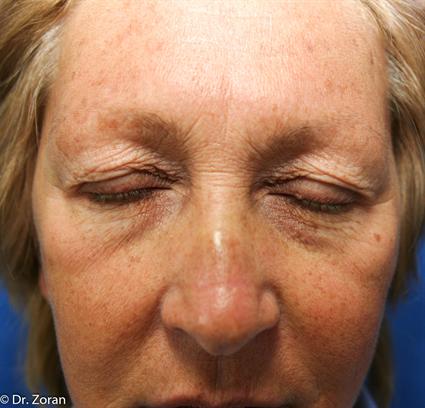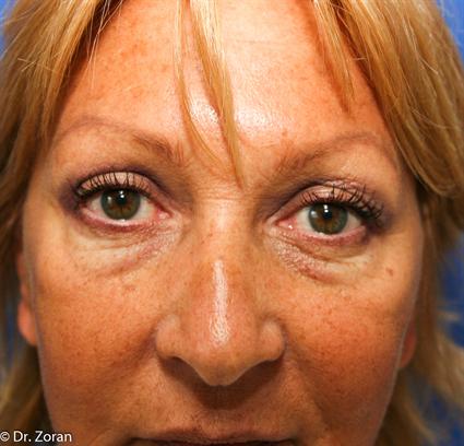Patient is shown before (left) and 9 months after upper and lower eyelid surgery (upper and lower blepharoplasty) on the right. Patient also had a Botox Cosmetic to lift her brows and diminish heavy wrinkles between her brows and above the nose. She also had an intermediate strength chemical peel, TCA peel, to treat fine wrinkles around the eyes and improve lower eyelid skin tone and discoloration (depigmentation).