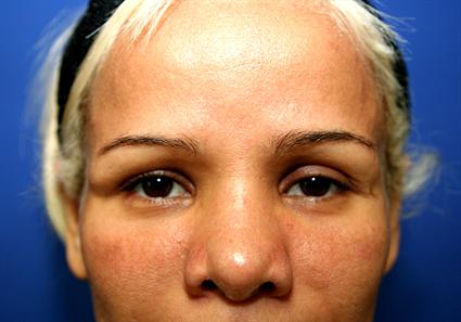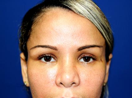 Her surgery was performed under local anesthesia in our plastic surgery center in Fort Lauderdale. Incisions were made within hearbearing area of the temple, eyebrows were pulled up and set in higher, symmetric position. Lateral orbital areas and outside portions ot upper eyelids were pulled back and up and fixet in desired position. No skin was removed from the temples.