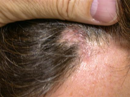A fresh scar hidden in the hairline 6 months after endoscopic surgery (left). This scar will continue to improve and fade.