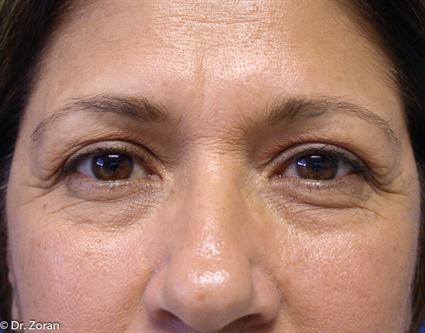 This 56 year-old Boca Raton cosmetic surgery patient, a successful professional women, wanted a full facial rejuvenation including upper and lower eyelid surgery. She presented with minimal early signs of aging of the eyelids demonstrated on her preoperative image; hooding of the upper eyelids, bulging bags on the lower eyelids with distinct groove (tear trough) dividing cheek from lower eyelid (left). This typical pattern of peri-orbital aging (eyes and around the eyes area) happens mostly due to diminished eyelid support and loss of fat in the cheeks and around the eyes.