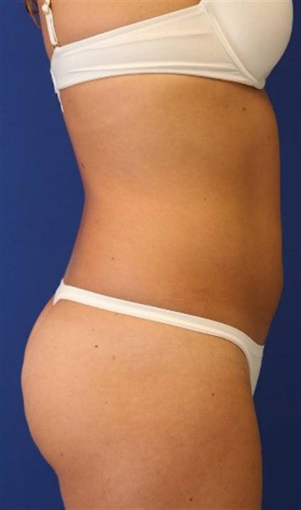 Surgery was done in our AAAA accredited surgery center in general anesthesia. Very conservative fat removal (total of 550 ml of fat) was done using mechanical powered liposuction technique. Patient was discharged home 1 hour after surgery. She was placed in compressive garment for 3 weeks to avoid swelling and help with uneventful healing. A series of small 0.5 cm incisions in hidden areas and creases of groin, flanks and belly button were used to place suction cannulas.