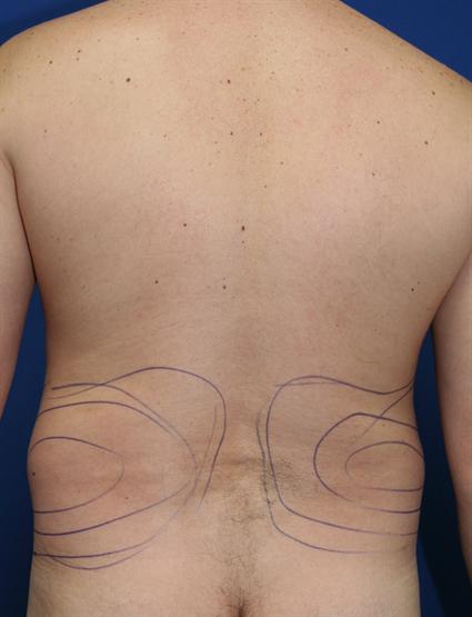 Images on the left show patient before liposuction surgery; areas marked with a blue marker are those that will require the most aggressive liposuction. On the right patient is shown 4 months after body contouring surgery of abdomen, breasts and neck with liposuction.