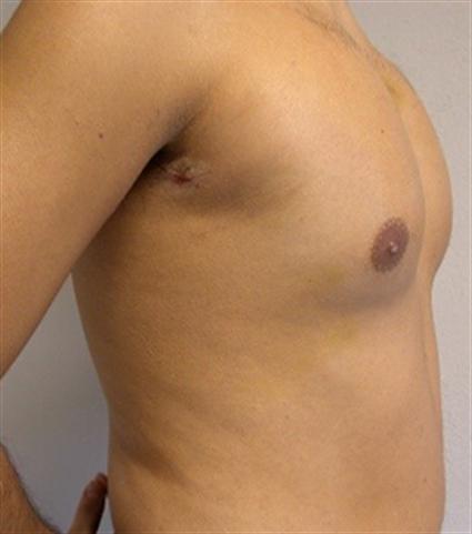 His surgery, pectoral augmentation with implants was done under general anesthesia; implants were placed underneath pectoralis major muscles through a 7.5 cm (3”) long incision placed in the arm pit. His recovery was uneventful and he was back to his regular activities 7 days after surgery. He is “delighted” with his appearance in tie shirt which shows his well contoured pectoral muscles. He now goes to gym more regularly in order to keep his arm muscles in good tone and “in proportion to his pecks”. Postoperative image 1.5 years after peck implants on the right.