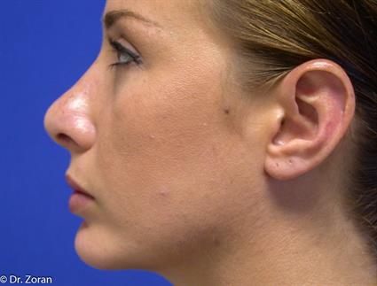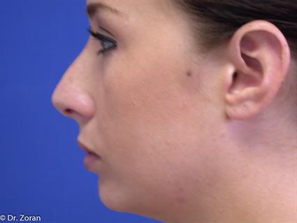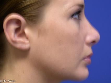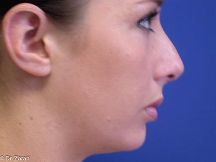 Patient’s profile postoperative photos demonstrate that nose surgery (rhinoplasty) corrected nose hump and rotated nose tip slightly upwards; nose tip became the most prominent point of nose profile which is desired aesthetic feature. Gentle curve from nose tip to the forehead is another feature of aesthetically pleasing nose. The chin augmentation with implant has improved balance of the lower face and neck on the profile view as if patient had a neck lift or neck lipectomy. Combination of nose surgery and chin enhancement created balance and harmony of the entire face.