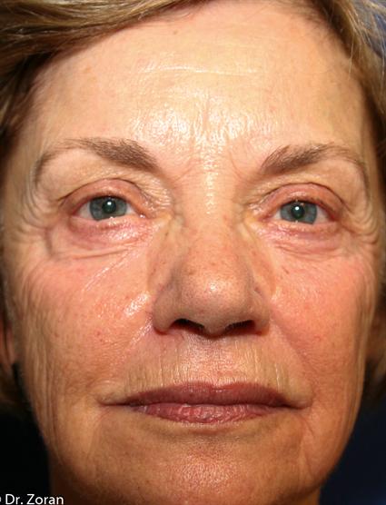 Before facial rejuvenation surgery (left) and 1.5 years after facelift, upper and lower eyelid and endoscopic brow lift surgery (right). Patient had a TCA chemical peel 3 months after surgery. Notice improvement in the neck, jawline, cheeks, around the eyes and mouth. A significant lift and shaping of the brows was achieved with endoscopic brow lift.