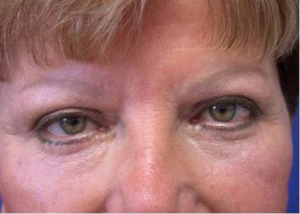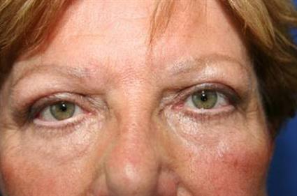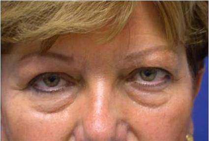 A 64 year-old plastic surgery Ft. Lauderdale patient was concerned about appearance of her eyes. She complained about droopy upper eyelids that partially occluded her side vision. She was also concerned about appearance of her puffed lower eyelids with deep groove that give impression that she is tired and said (left).